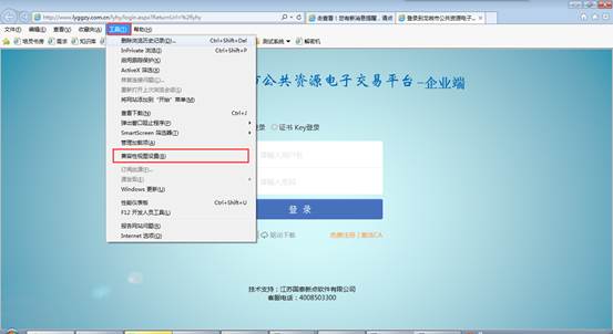 1、点击浏览器菜单栏里的“工具”,选择下拉菜单的“兼容性视图设置”: