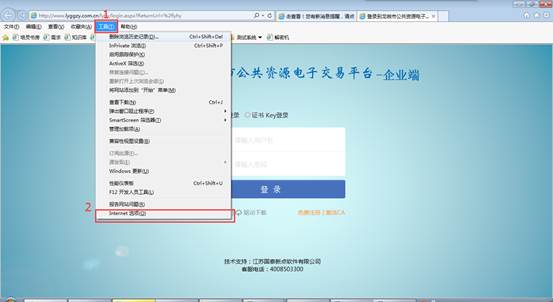 1、点击浏览器菜单栏里的“工具”,选择下拉菜单的“Internet选项”: