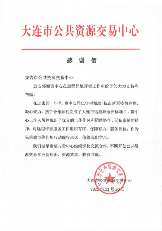 近日,365彩票手机版下载_注册office365邮箱_365电竞比分公共资源交易中心收到大连市公共资源交易中心的一封感谢信。对在2021年新冠肺炎疫情中365彩票手机版下载_注册office365邮箱_365电竞比分公共资源交易中心凝心聚力、守望相助,携手合作顺利完成大连市远程异地评标项目表达诚挚谢意。对365彩票手机版下载_注册office365邮箱_365电竞比分公共资源交易中心工作人员在工作中展现出的团结协作、无私奉献的精神和优良的工作作风表示赞赏。